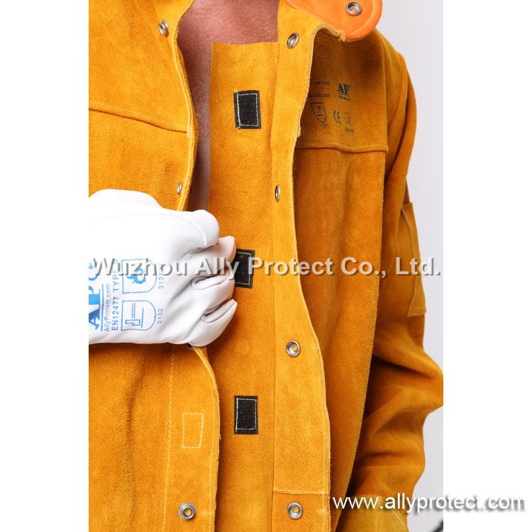 - Product description: [ AP ]CE certificated.Full leather welding jacket for perfect protection and Golden colour make products fashion and showy.