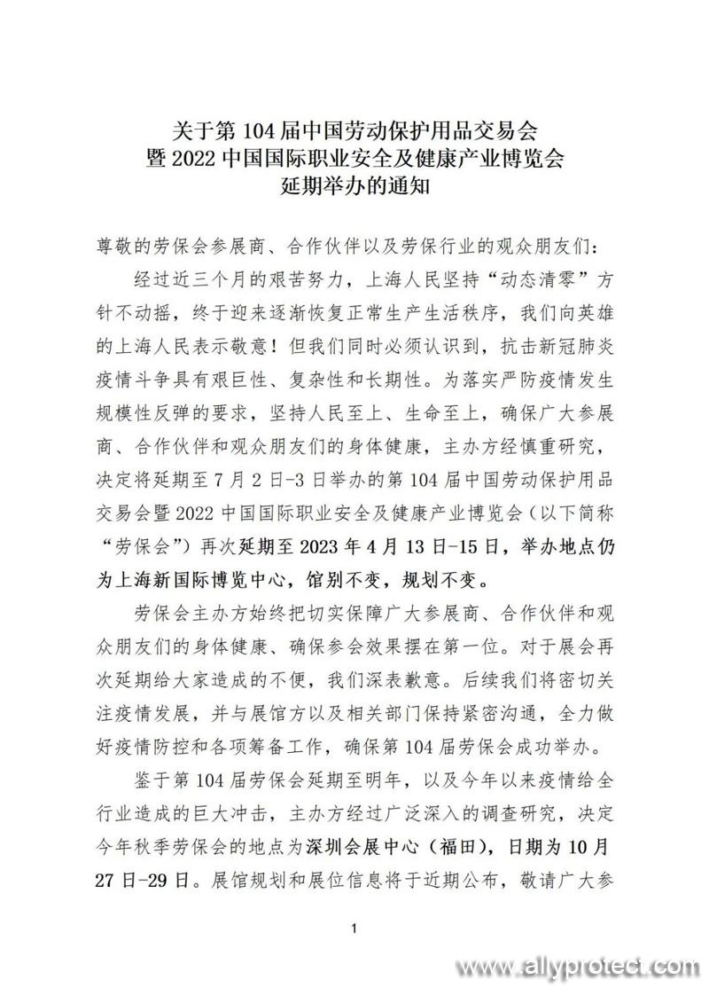 經過近三個月的艱苦努力,上海人民堅持“動態(tài)清零”方針不動搖,終于迎來逐漸恢復正常生產生活秩序,我們向英雄的上海人民表示敬意!但我們同時必須認識到,抗擊新冠肺炎疫情斗爭具有艱巨性、復雜性和長期性。為落實嚴防疫情發(fā)生規(guī)模性反彈的要求,堅持人民至上、生命至上,確保廣大參展商、合作伙伴和觀眾朋友們的身體健康,主辦方經慎重研究,決定將延期至7月2日-3日舉辦的第104屆中國勞動保護用品交易會暨2022中國國際職業(yè)安全及健康產業(yè)博覽會(以下簡稱“勞保會”)再次延期至2023年4月13日-15日,舉辦地點仍為上海新國際博覽中心,館別不變,規(guī)劃不變。